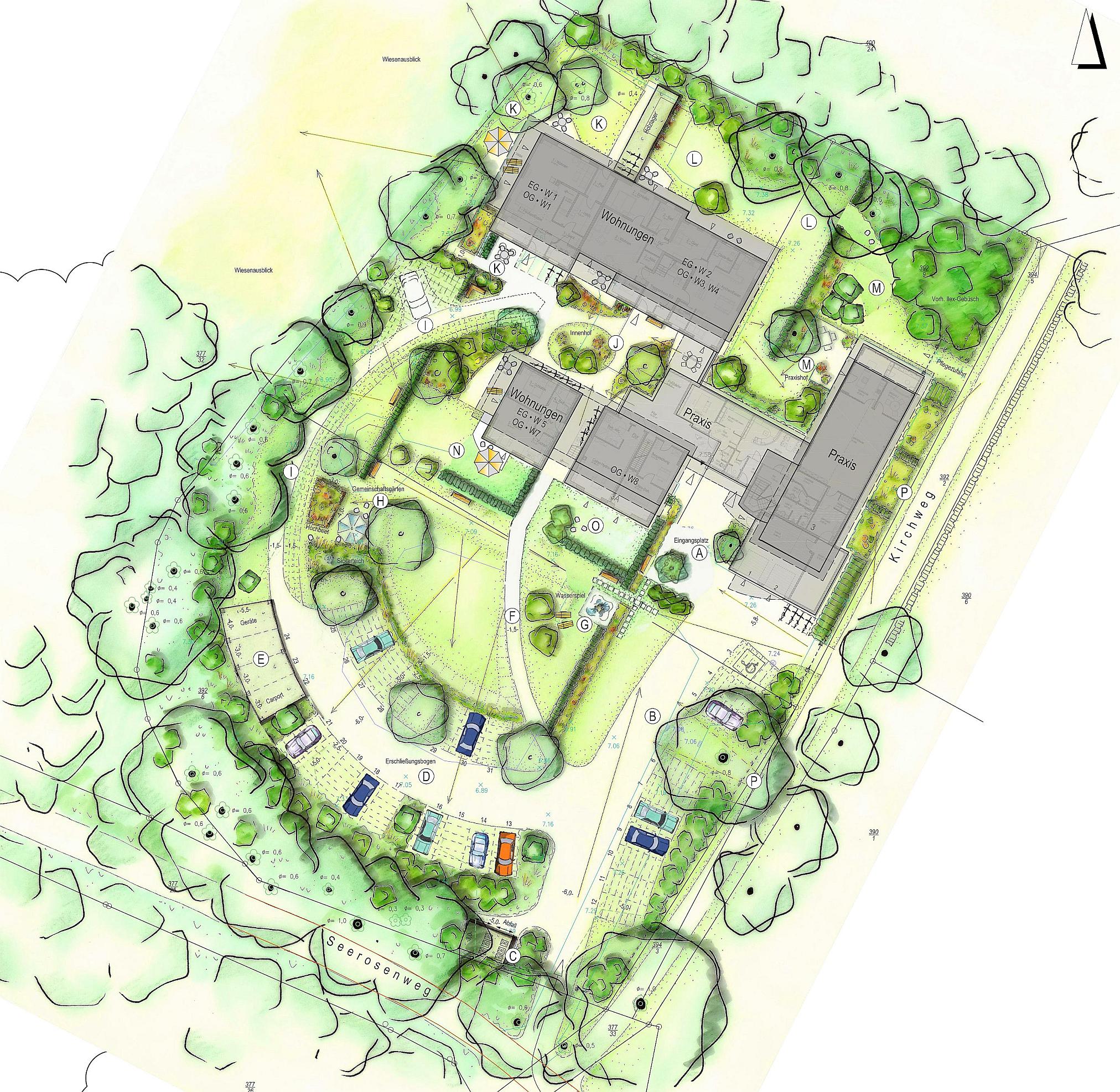 - Die Gesamtgestaltung basiert auf halbtransparenten Räumen. Nahe an Gebäuden, Terrassen und Praxis grenzen sich die genutzten Freiräume optisch ab. Mit zunehmender Entfernung werden sie offener und kommunikativer, sodass der Gesamtraum übergreifend als gemeinschaftlicher Freiraum wahrgenommen wird.