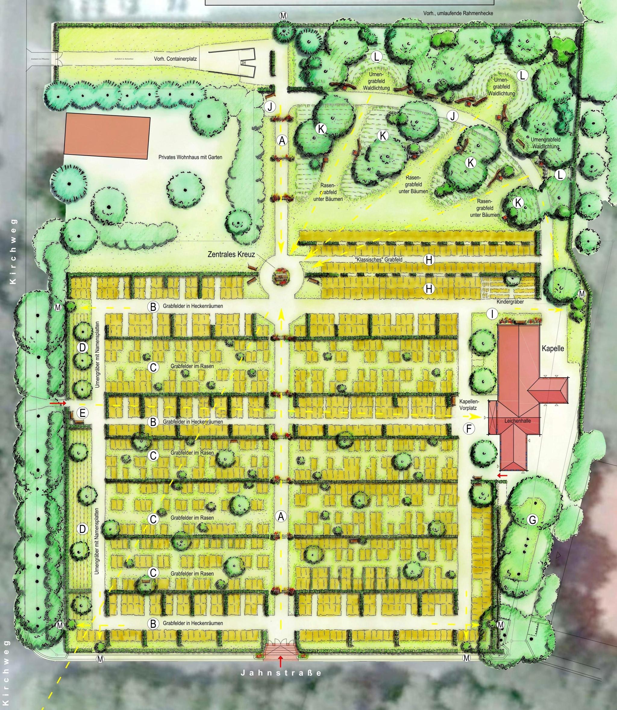 - Das Gesamt-Entwicklungskonzept beinhaltet Vorschläge für eine langfristige Weiterentwicklung des Friedhofs, speziell vor dem Hintergrund zunehmend neuer Bestattungsformen, wie Urnengräber, pflegeleichter Rasengräber, friedwaldähnlicher Baumhaine u. Ä.