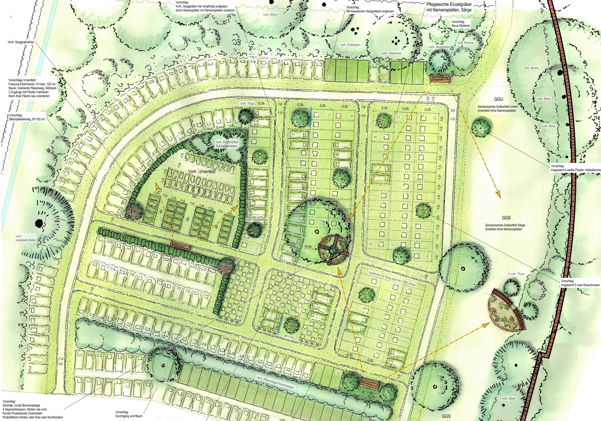 - Umwandlung eines in Auflösung befindlichen klassischen Grabfeldes zu einem Pflegeleichten Rasengrabfeld für Särge und Urnen