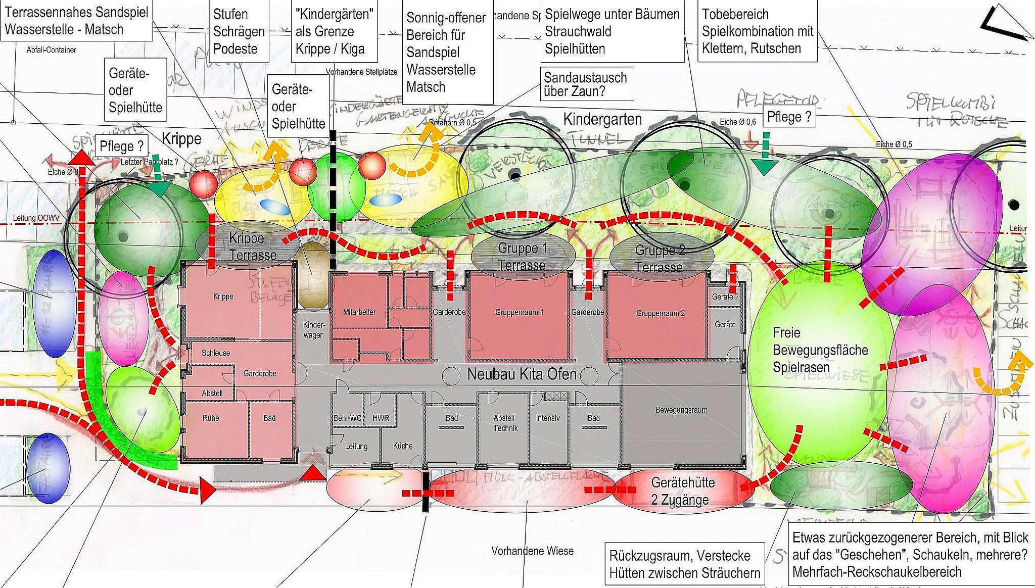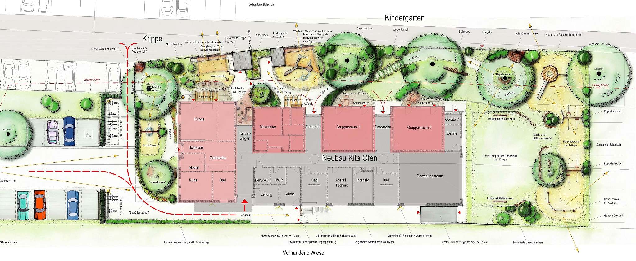 - Kompletter Neubau der Freianlagen von Kindergarten und Krippe