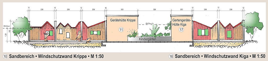 - Als „Häuser“ gestaltete Wind- und Sichtschutzelemente mit verschließbaren Fenstern zwischen Straße und Sand-Matschbereichen