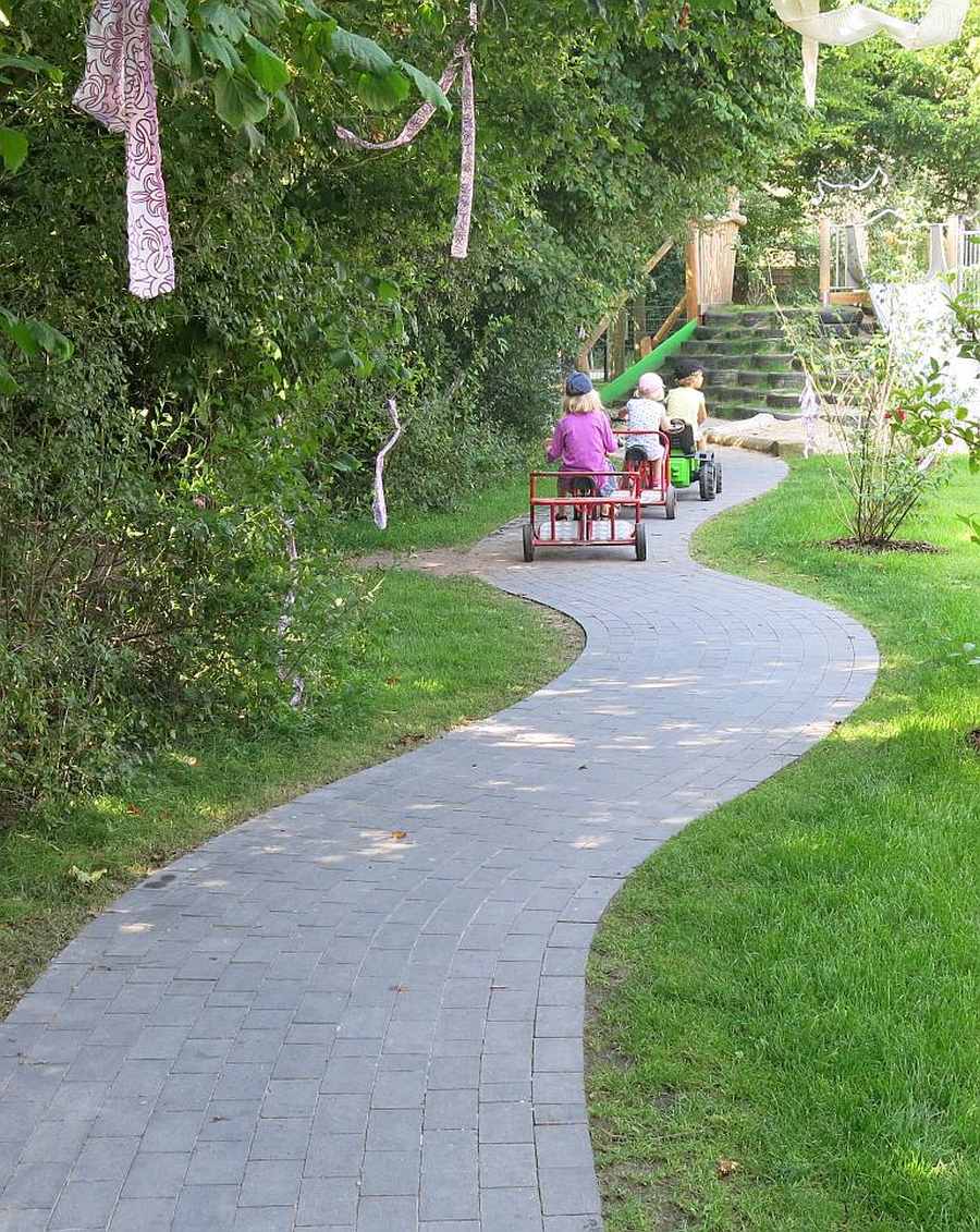 An die Terrassen gliedern sich zuerst Gerätelose freie Rasenspielflächen an. Die beliebten Spiel-Fahrwege haben auch eine wirkliche Funktion, in dem sie die unterschiedlichen Spielbereiche verbinden. Entlang des langen Zick-Zack-Zaunes durch die Strauchwildnis haben sich –. wie vom Planer erhofft – regelrechte Schleichwege und Geheimgänge von Hütte zu Hütte ergeben, wo Kinder sich auch mal verstecken und zurückziehen können.