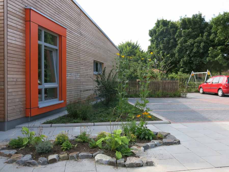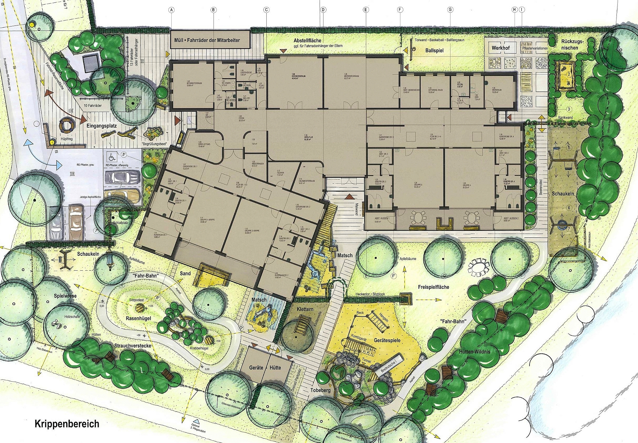 Die gesamten Außenanlagen und Spielflächen nehmen die Gestaltungssprache des Hochbaus auf und betten die Spielflächen zugleich harmonisch in die Grüne Umgebung ein. Auch Kleinkinder mit guter Gestaltung zu umgeben ist dabei ein bewusster Ansatz. Ebenso sind die notwendigen Einfriedungen transparent, mit vielen Durchblicken oder im Zickzack den vorh. Sträuchern u Bäumen folgend geplant, um den Kindern eine in die Siedlung und Umgebung eingebettete Atmosphäre zu vermitteln, statt einen „Sperrbezirk“ zu markieren.