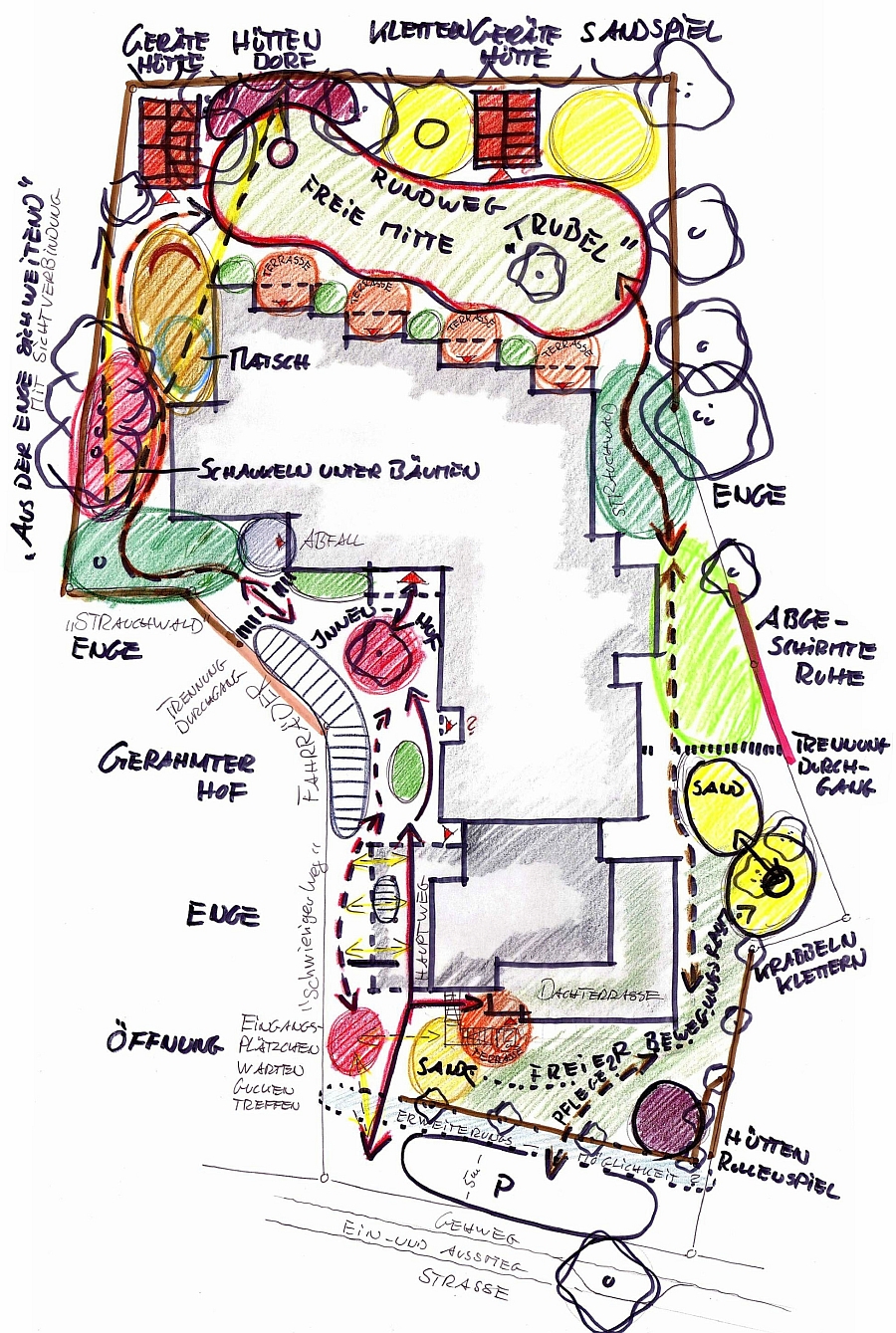 - Maximale Ausnutzung auch der seitlichen Abstandsflächen und des Zugangs als Spiel- und Erlebensbereich für die Kinder