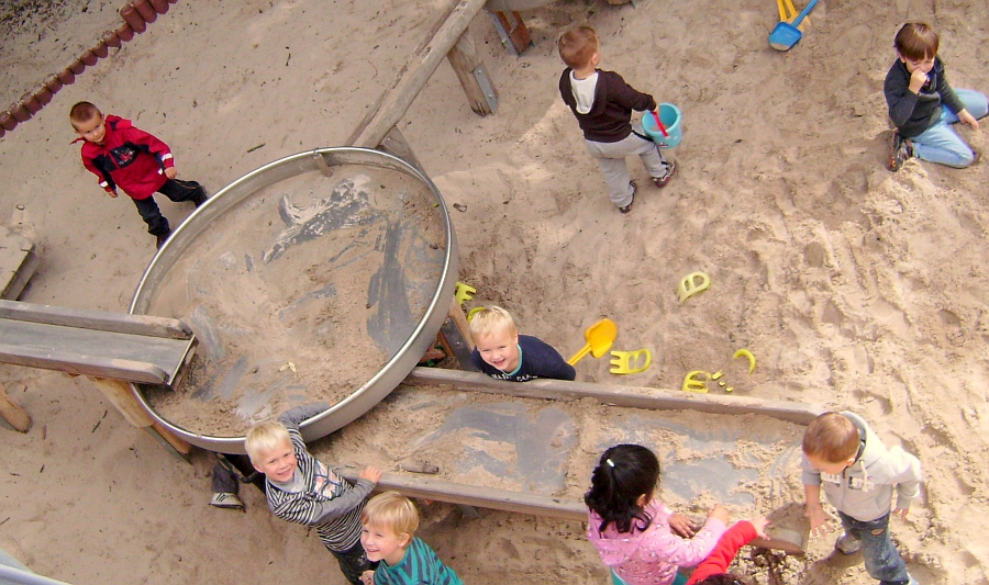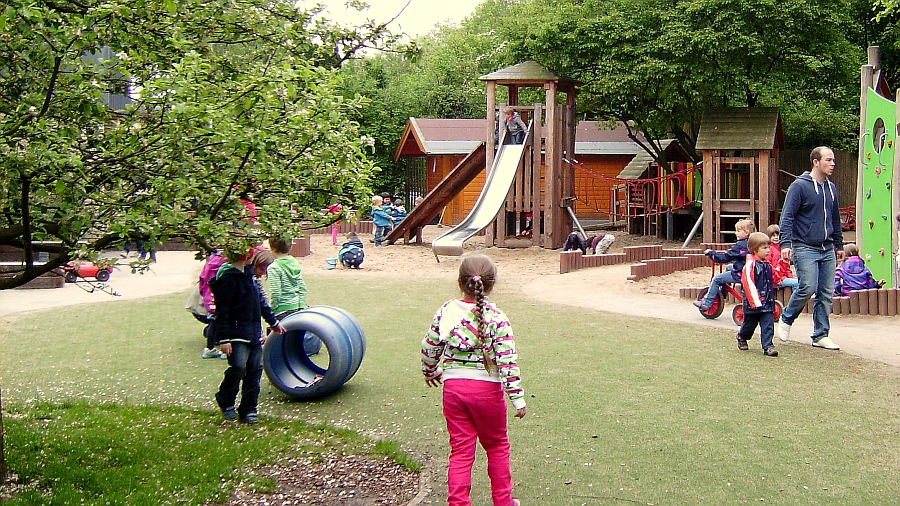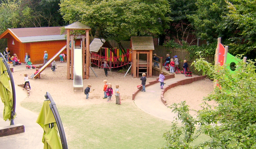 In einen vorhandenen Kindergarten musste eine zusätzliche Krippengruppe baulich und in den Freispielanlagen als abgegrenzte Spielfläche integriert werden. Um die notwendige Spielfläche zu erhalten, wurden auch bisher ungenutzte Abstands- und Abstellflächen an den schmalen Grundstückseiten zu attraktiven Spiel- Rückzugs- und Tobeflächen umgestaltet, in denen sich die vielen Kinder gleichzeitig betätigen können. Wesentliches Element ist eine ganzjährig, bei jedem Wetter bespielbare freie Mitte aus Kunstrasenbelag, für Ball und Tobespiele-, aber auch Kindergartenfeste geeignet. Drumherum verbindet ein kurviger „Fahrspielweg“ die an den Rändern angeordneten Matsch-, Kletter-, Sand- und Rollenspielbereiche. Die Verbindung und Integration von Kunstrasen für höchsten Spieldruck einerseits und naturnaher Strauch- und Baumwildnis, als wichtiger Sinneserfahrung andererseits, hat sich bisher sehr gut bewährt.