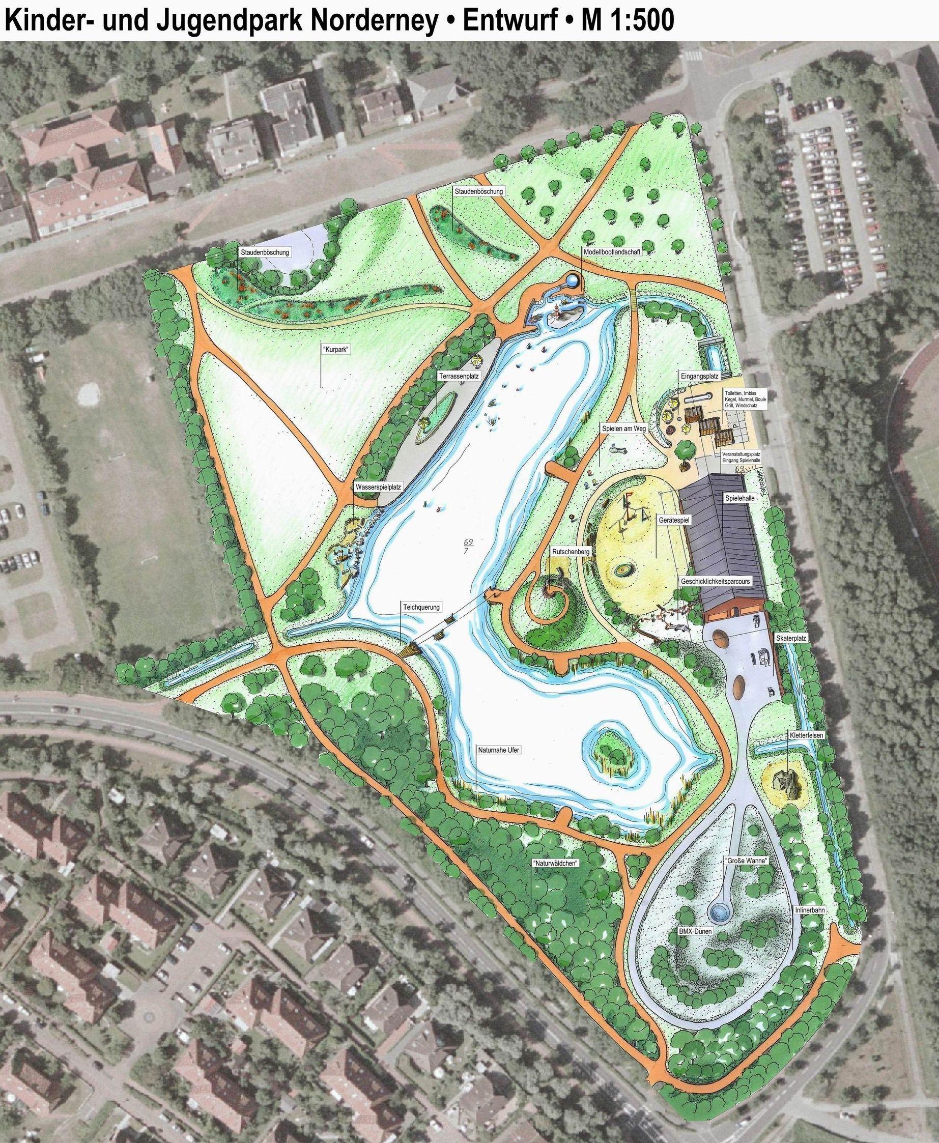 - Umgestaltung einer wenig genutzten Parkanlage in zentraler Lage zu einem vielgestaltigen Freizeitareal für alle Altersgruppen, auch als kostenfreies Alternativangebot zum Strand.