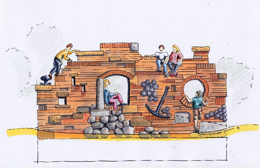 - Individuelle Klettermauern aus altem „Hafenmaterial“ in den „Dünen“ als eigener Treffpunkt