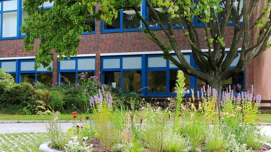 - Zentrale Begrüßungs-Staudenbeete als Schülerbeete im Vorplatz (Schule und Schüler zeigen sich…)