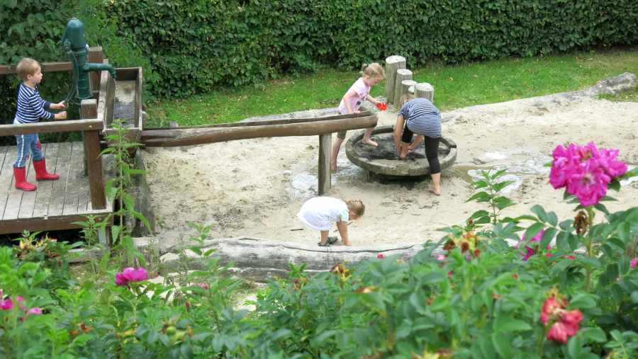 Dank formaler Abgrenzung zum eigentlichen Spielplatz, dürfen die Kinder im beibehaltenen Wald Spielen „wie früher“, Hütten bauen, Zweige abbrechen, auf Bäume klettern