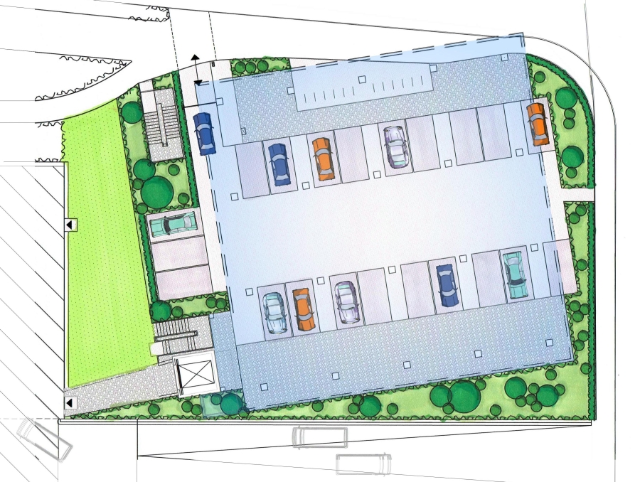 - Die Stellplatzanlage wurde unter einem aufgeständerten Hubschrauberlandeplatz eingepasst.